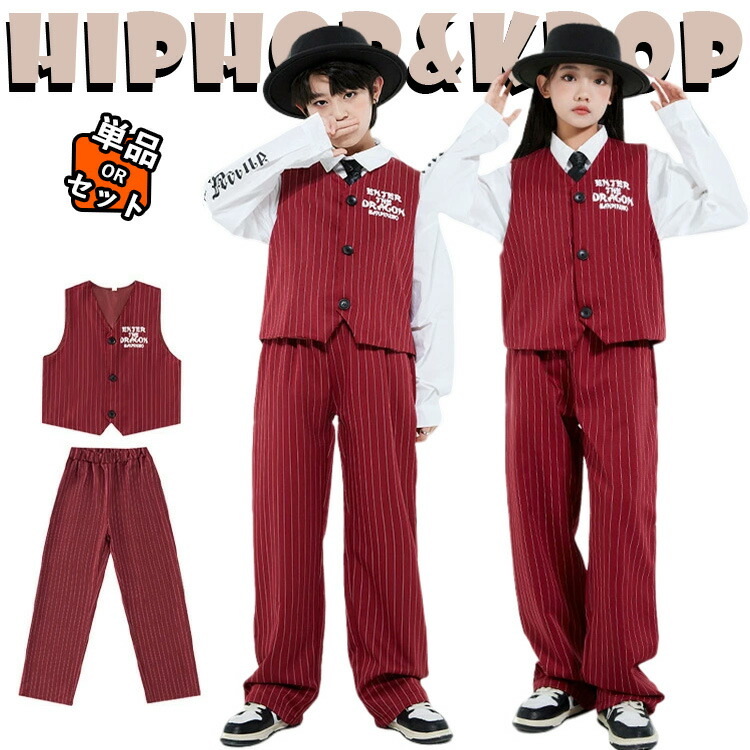 ワインレッド ベスト パンツ 白シャツ パンツスーツ キッズ ダンス衣装 韓国 K-POP HIPHOP セットアップ 単品販売 長袖シャツ 女の子 男の子 パフォーマンス服 子供服 演出服 団体服