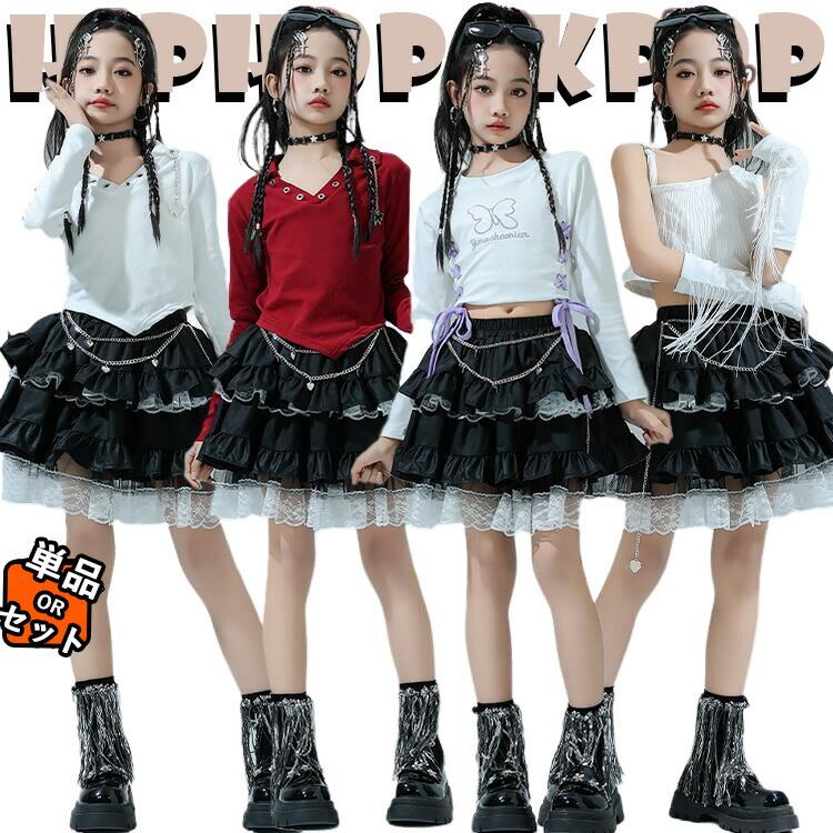 jazz タッセル フリンジ レース へそ出し キッズ ダンス衣装 セットアップ 女の子 長袖 ショート丈 ティアードスカート ソックス チア チアガール hiphop ジャズダンス ヒップホップ