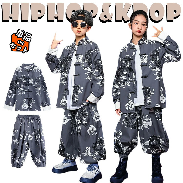 唐装 グレー トップス カジュアルパンツ 白 Tシャツ キッズ ダンス衣装 セットアップ 上下セット おしゃれ 女の子 男の子 かっこいい かわいい ゆったり 長袖 中華風 ダンスウエア ヒ