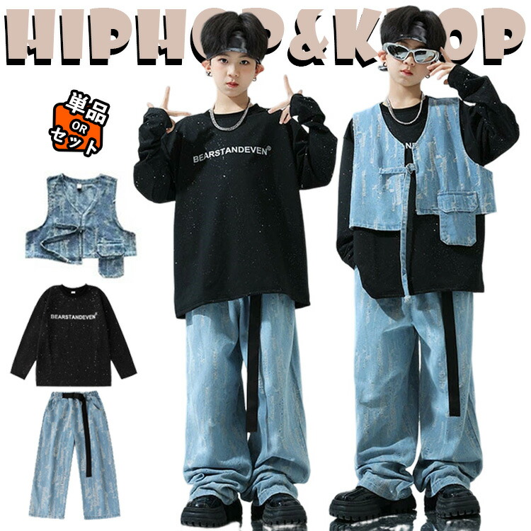 デニム ブルー カジュアルパンツ ベスト 黒 シャツ キッズ ダンス衣装 セットアップ 上下セット おしゃれ 女の子 男の子 かっこいい かわいい ゆったり 長袖 トップス ダンスウエア