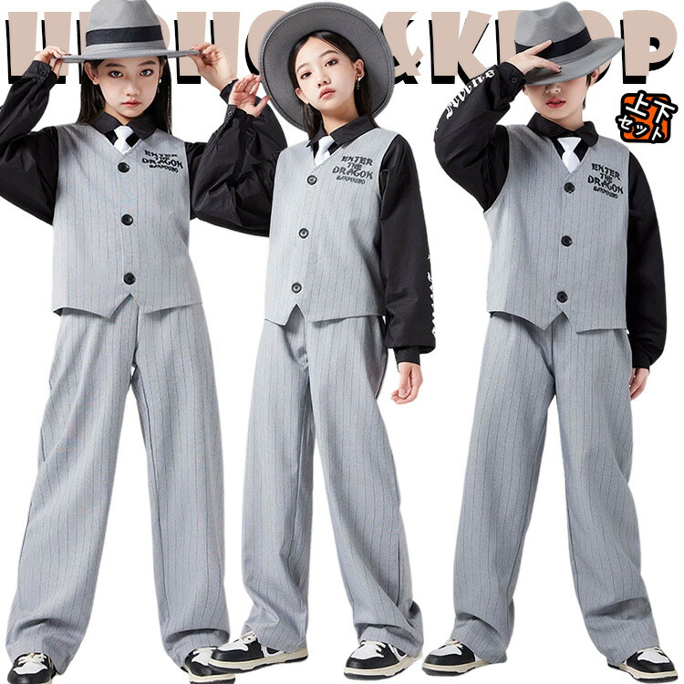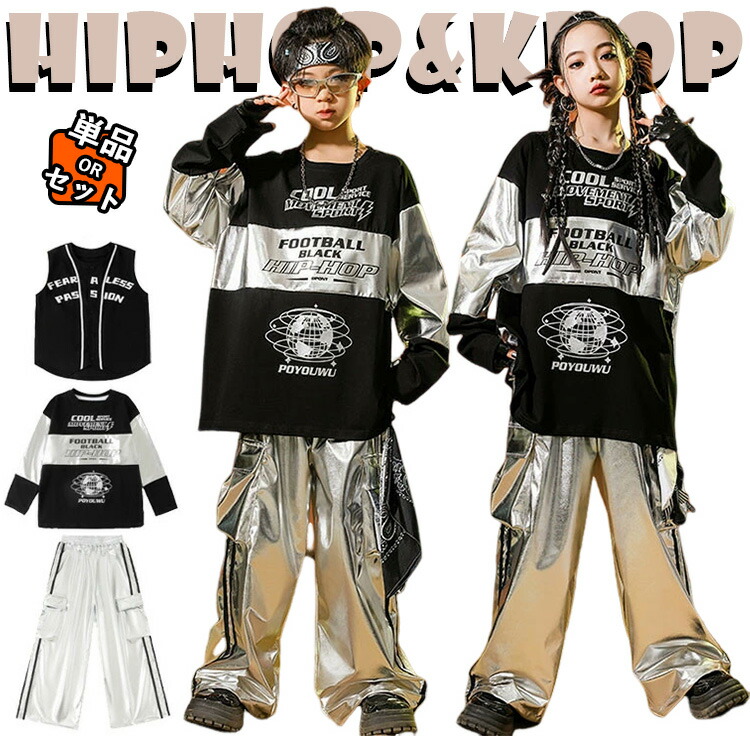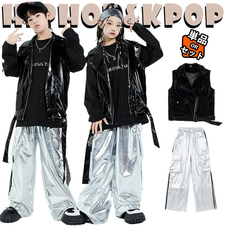 革ベスト キッズ ユニセックス衣装 ダンス衣装 セットアップ 上下セット 男の子 女の子 ライナー ロングシャツ トップス シルバー カーゴパンツ サルエルパンツ ジャズダンス ヒ