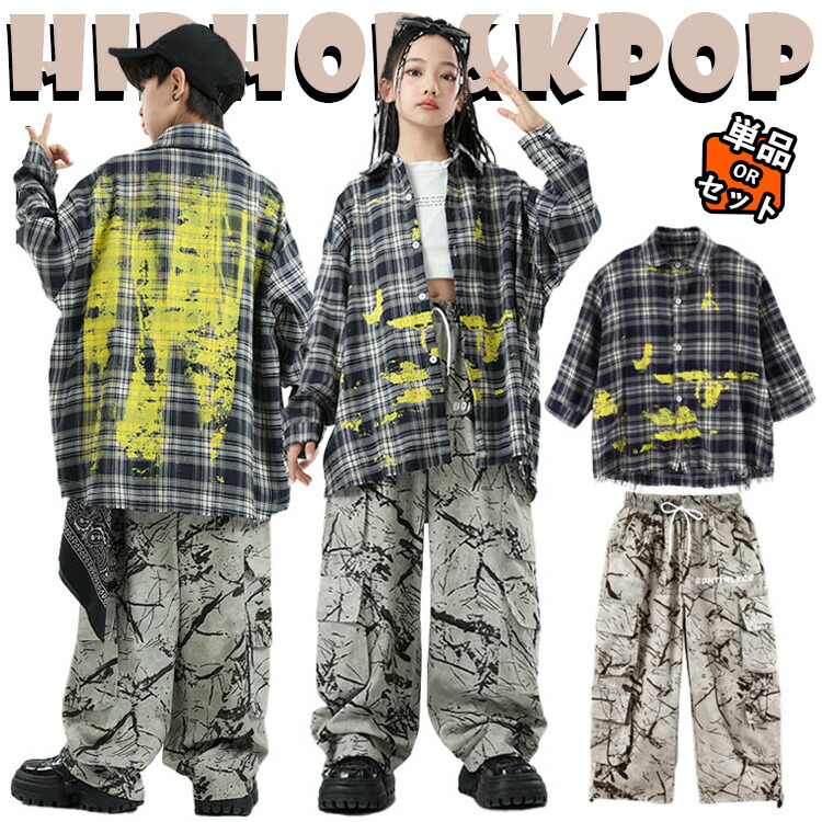 キッズ ダンス衣装 セットアップ ユニセックス衣装 長袖 チェック柄 シャツ ジャケット カジュアルシャツ トップス へそ出し 迷彩柄 カーゴパンツ サルエルパンツ 上下セット ジャズ