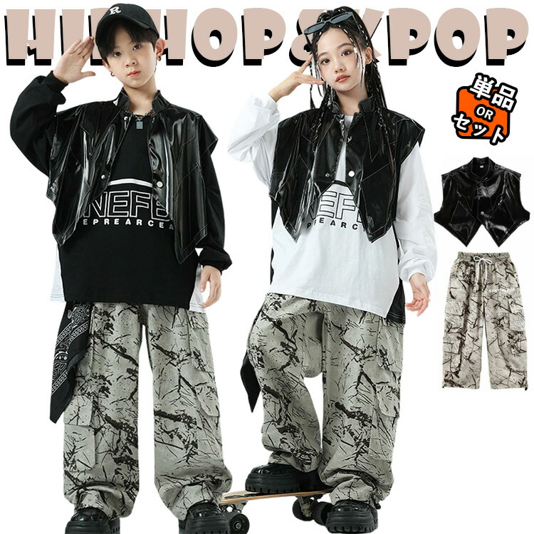 革ベスト セット キッズ ユニセックス衣装 ダンス衣装 セットアップ 上下セット 男の子 女の子 ロングシャツ トップス カーゴパンツ サルエルパンツ ジャズダンス ヒップホッ