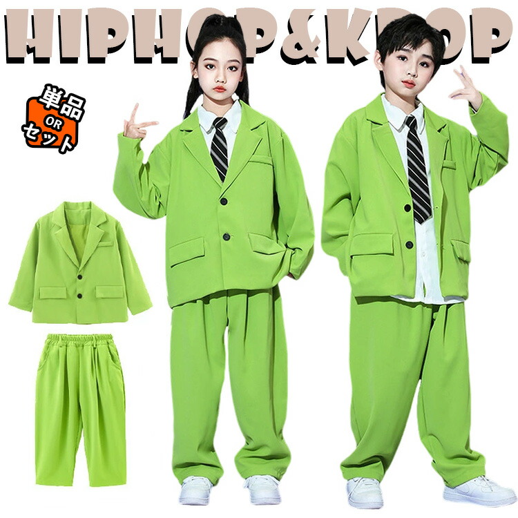キッズ ダンス衣装 グリーン パンツスーツ ファション フォーマル スーツ ジャケット パンツ セットアップ 上下セット おしゃれ 女の子 男の子 かっこいい かわいい シャツ ダンスウ