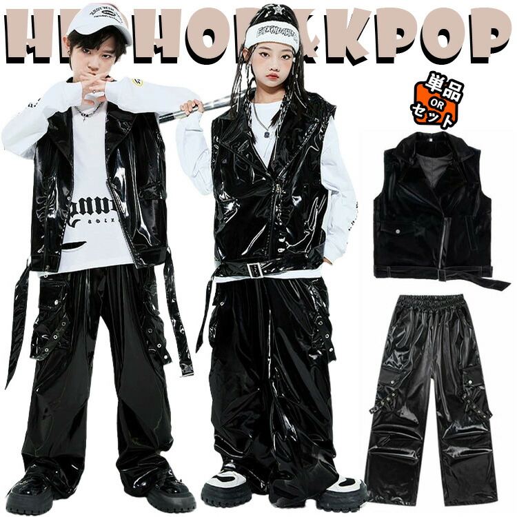pu 革ベスト セット キッズ ユニセックス衣装 ダンス衣装 セットアップ 上下セット 男の子 女の子 ロングtシャツ トップス pu カーゴパンツ サルエルパンツ ジャズダンス ヒップホッ