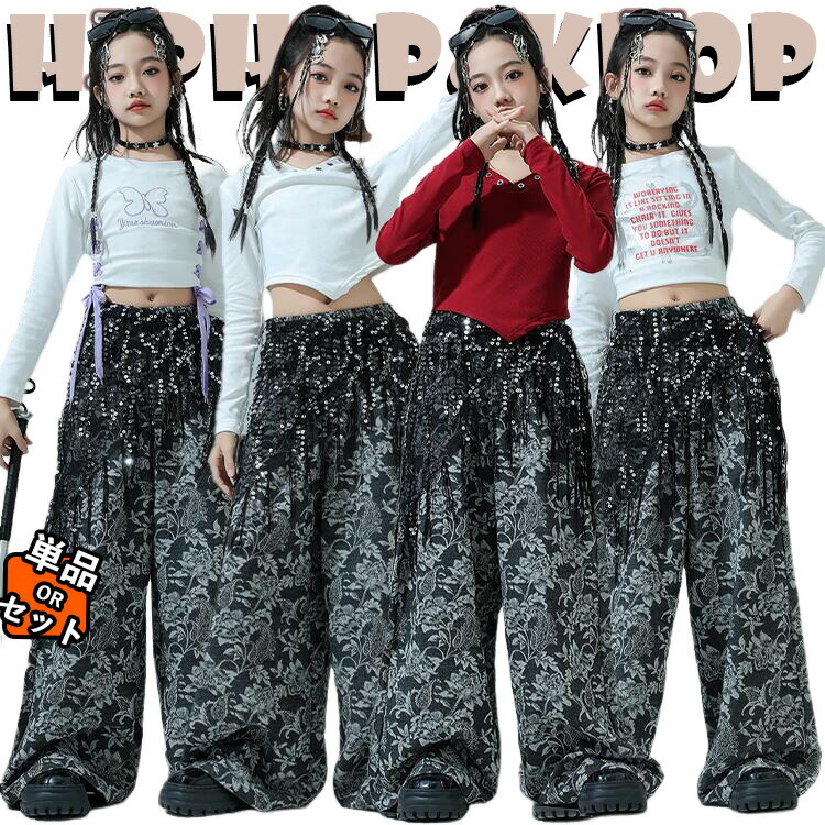 jazz 総柄 タッセル フリンジ レース へそ出し キッズ ダンス衣装 セットアップ 女の子 長袖 ショート丈 サルエルパンツ カーゴパンツ 腰飾り チア チアガール hiphop ジャズダンス