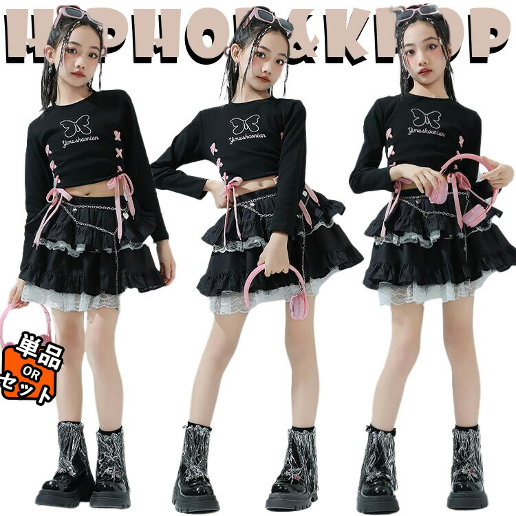 jazz タッセル フリンジ レース リボン へそ出し キッズ ダンス衣装 セットアップ 女の子 長袖 ショート丈 ティアードスカート ソックス チア チアガール hiphop ジャズダンス ヒップ