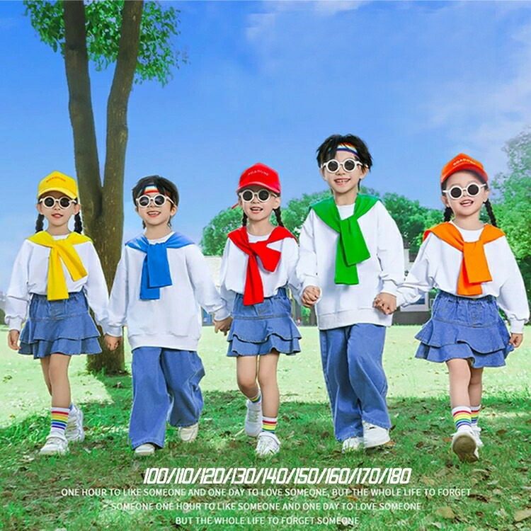 白 青 小学生 秋服 団体服 上下セット スウェット トレーナー デニムスカート デニムパンツ 6色 肩掛け キッズ ダンス衣装 チア チアガール チアリーダー 長袖 おしゃれ 可愛い 女の