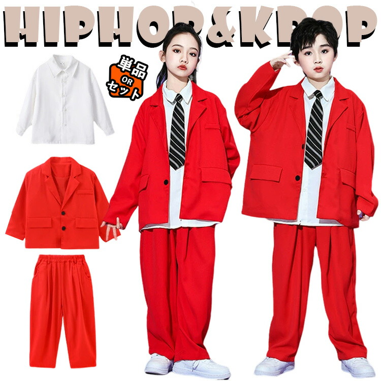 赤色 レッド パンツスーツ キッズ ダンス衣装 セットアップ ジャケット パンツ 長袖 半袖 白シャツ ネクタイ ゆったり 女の子 男の子 子供 演出服 団体服 発表会 ヒップホップ