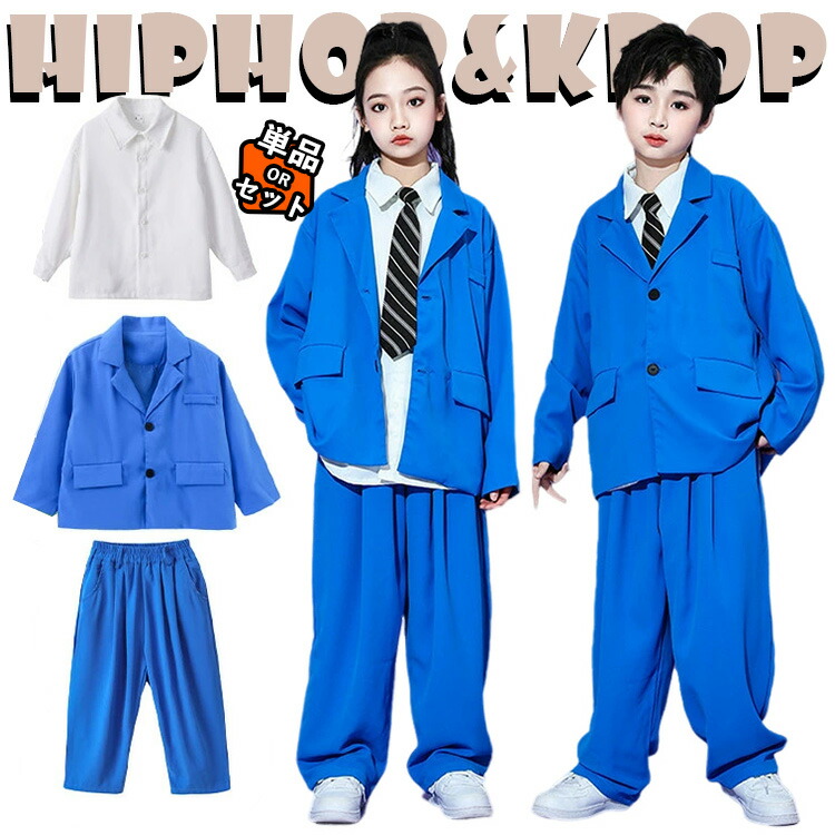 ブルー パンツスーツ キッズ ダンス衣装 セットアップ ジャケット パンツ 長袖 半袖 白シャツ ネクタイ jazz ゆったり 女の子 男の子 子供 演出服 団体服 発表会 ヒップホップ 韓国 K