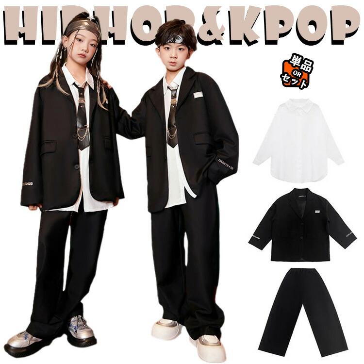 黒 パンツスーツ キッズ ダンス衣装 セットアップ ジャケット パンツ 長袖 半袖 白シャツ ネクタイ ゆったり 女の子 男の子 子供服 演出服 団体服 発表会 ヒップホップ 韓国 K-POP HI