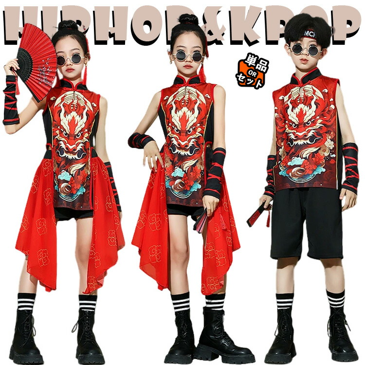レッド 赤色 中国風 上下セット ノースリーブ トップス 半ズボン キッズ ダンス衣装 jazz チア チアガール チアリーダー 袖無し おしゃれ 女の子 男の子 パフォーマンス衣装 子供服