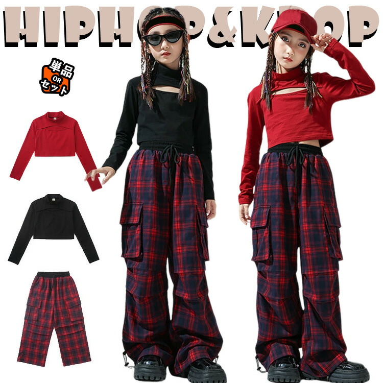 キッズ ダンス衣装 長袖 黒 赤 トップス チェック柄 ウェストパンツ セットアップ 上下セット おしゃれ 女の子 かっこいい かわいい カーゴパンツ カジュアル ダンスウエア ヒップホ