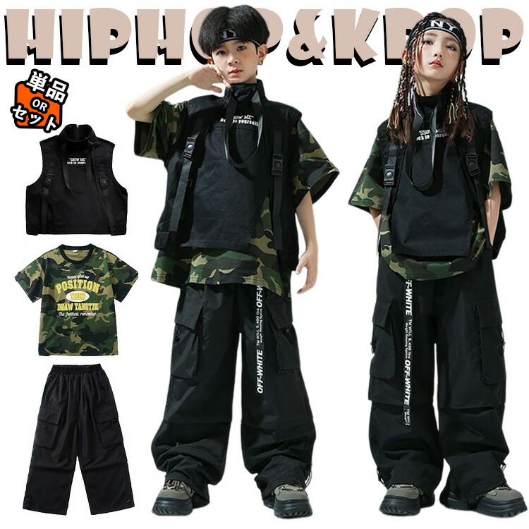 キッズ ダンス衣装 迷彩柄 黒色 カーキグリーン ベスト カーゴパンツ Tシャツ 3点セット 韓国 K-POP HIPHOP jazz セットアップ 長袖 tシャツ ワイドパンツ ゆったり 女の子 男
