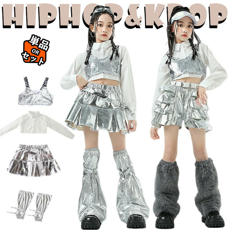 キラキラ シルバー キャミソール 白 シャツ スカート パンツ 足カバー キッズ ダンス衣装 セットアップ 上下セット おしゃれ 女の子 かっこいい かわいい 長袖 ダンスウエア ヒッ
