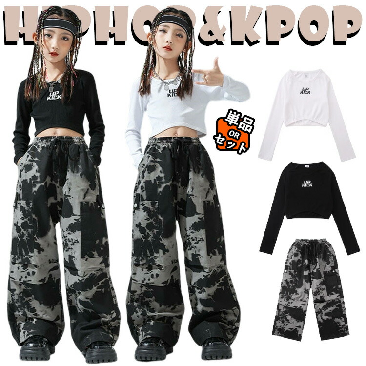 黒 白 トップス 総柄 迷彩 ウェストパンツ 韓国 キッズ ダンス衣装 セットアップ 上下セット おしゃれ 女の子 かっこいい かわいい へそ出し 長袖 カジュアル ダンスウエア ヒッ