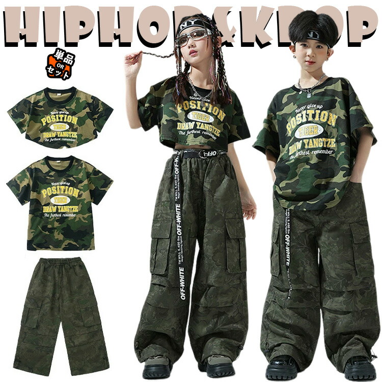 キッズ ダンス衣装 迷彩柄 カーキグリーン カーゴパンツ Tシャツ ショートトップ セットアップ ゆったり 半袖 tシャツ ワイドパンツ 女の子 男の子 子供服 練習着 演出服 団体服 発表