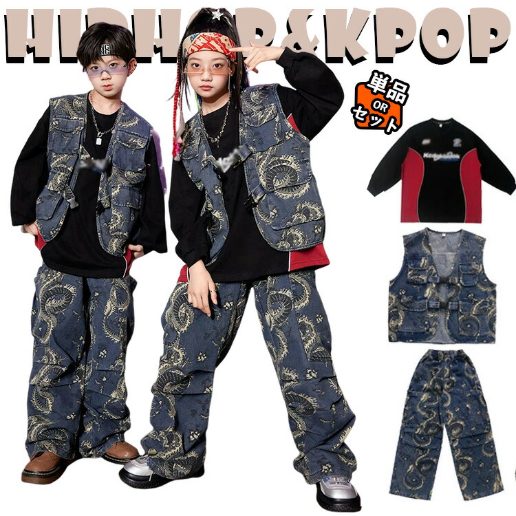 ダンス衣装 デニム ベスト 総柄 龍 カーゴパンツ シャツ キッズ セットアップ 上下セット おしゃれ 女の子 男の子 子供 かっこいい かわいい 長袖 カジュアル ダンスウエア ヒップホ