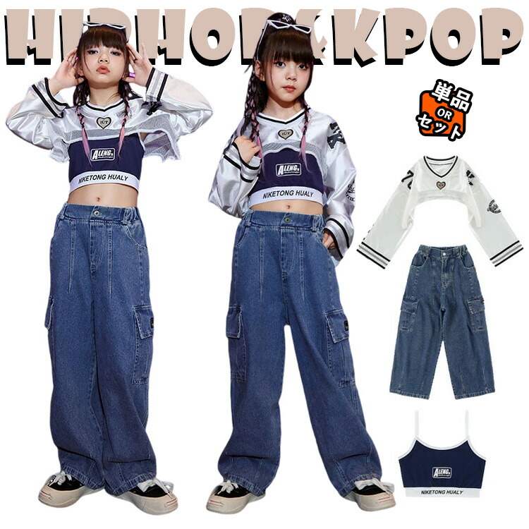 韓国 キッズ ダンス衣装 長袖 トップス 紺 キャミソール デニムパンツ セットアップ 上下セット おしゃれ 女の子 かっこいい かわいい カーゴパンツ カジュアル へそ出し ダンスウエ