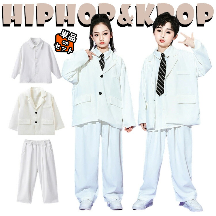 白 パンツスーツ キッズ ダンス衣装 セットアップ ゆったり ジャケット パンツ 長袖 半袖 白シャツ ネクタイ 女の子 男の子 子供服 韓国 - 演出服 団体服 発表会 練習着