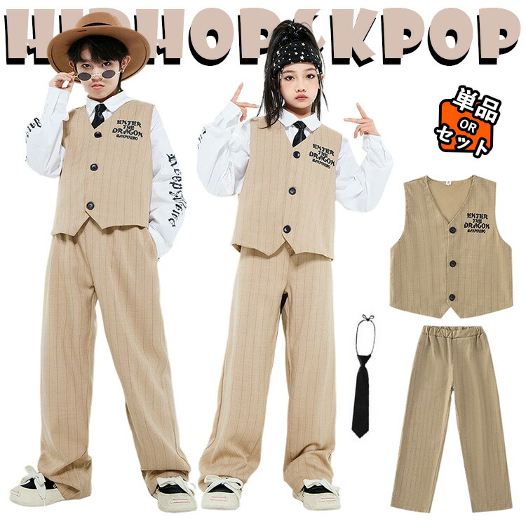 キッズ ダンス衣装 セットアップ カーキ色 ベスト パンツ 白シャツ パンツスーツ 韓国 K-POP HIPHOP 単品販売 長袖シャツ 女の子 男の子 パフォーマンス服 子供服 演出服 団体服 発表