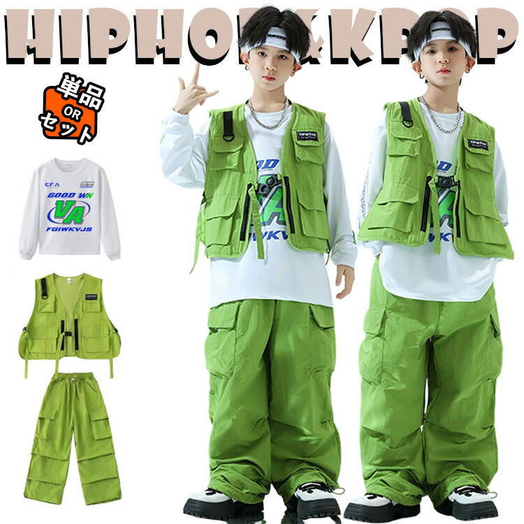 キッズ ダンス衣装 グリーン ベスト カーゴパンツ 白 Tシャツ セットアップ 上下セット おしゃれ 女の子 男の子 かっこいい かわいい ゆったり 長袖 トップス ダンスウエア ヒップホ