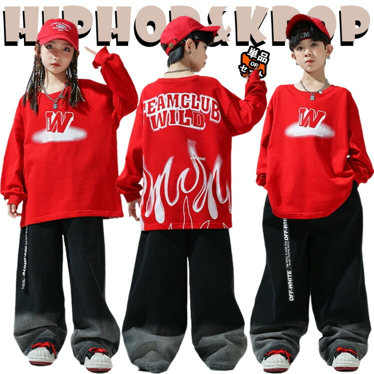 デニムパンツ スウェット キッズ ダンス衣装 長袖 トレーナー レッド ゆったり ワイドパンツ ヒップホップ jazz 韓国k-pop 男の子 女の子 セットアップ グラデーションカラー かっこ