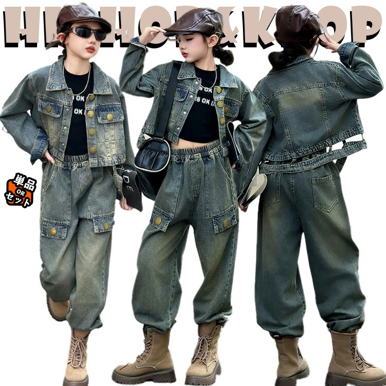 キーズ デニムセット セットアップ 秋服 デニムパンツ ジャケット カジュアル ジュニア カーゴパンツ 長袖 韓国 無地 春秋 ゆったり キッズ 女の子 上下セット 2点セット アウトドア