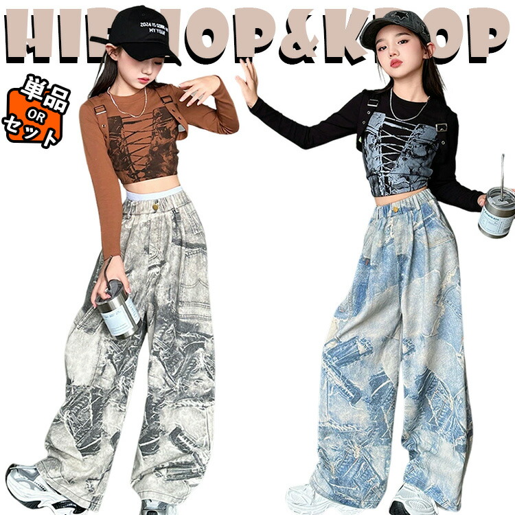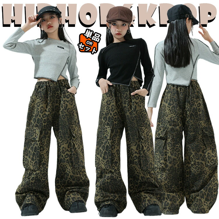 チア チアガール ブラウン ブラック ワイドパンツ デニムパンツ カーゴパンツ キッズ ダンス衣装 総柄 長袖 トップス へそ出し 韓国- ゆったり ジャズダンス 女の子 セット