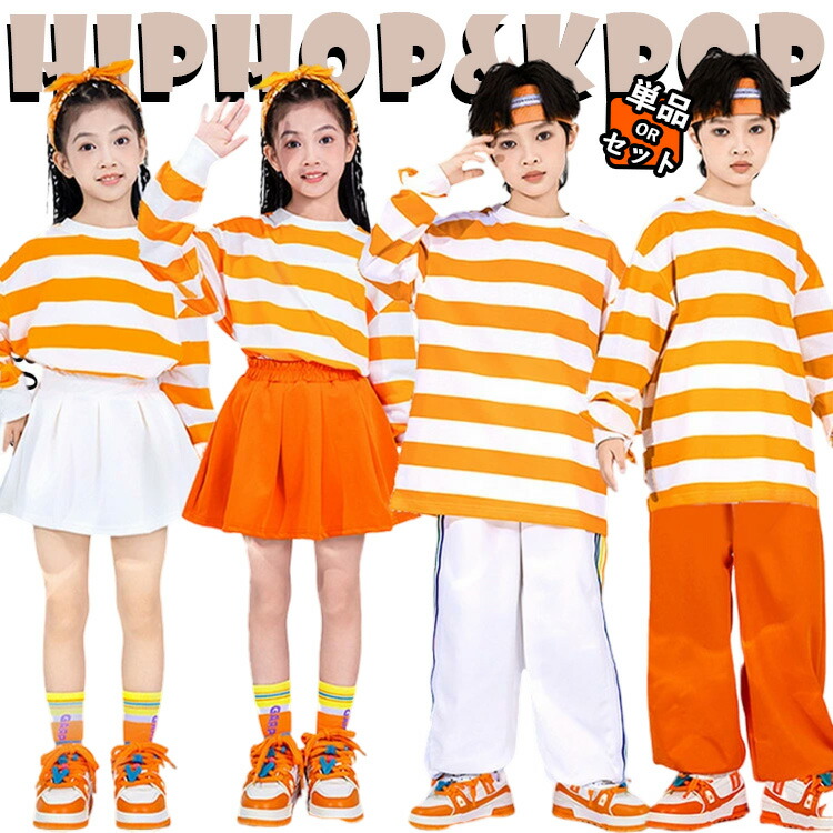 小学生 ストライプ柄 長袖tシャツ オレンジ 白 スカート パンツ クラス服 女の子 男の子 スポーツパンツ プリーツスカート ズボン キッズ ダンス衣装 上下セット ゆったり おしゃれ
