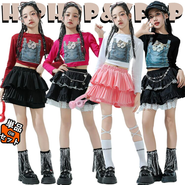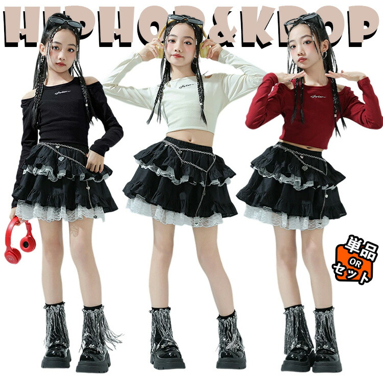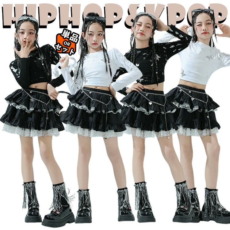 jazz レース へそ出し キッズ ダンス衣装 セットアップ 女の子 長袖 ショート丈 ティアードスカート フレアスカート ソックス チア チアガール hiphop ジャズダンス ヒップホップ 韓