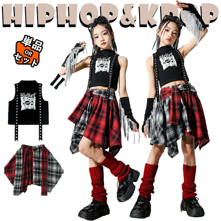 jazz 黒色 レッド チェック柄 パーチワーク タッセル フリンジ へそ出し 肩出し キッズ ダンス衣装 セットアップ 女の子 ショート丈 腕カバー スカート ソックス ジャズダンス 韓国 k