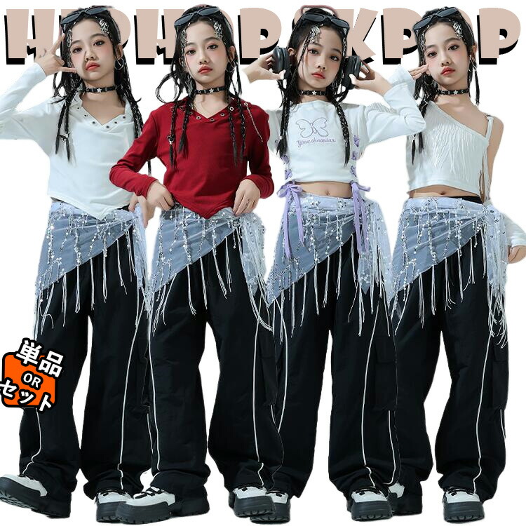 jazz タッセル フリンジ レース へそ出し キッズ ダンス衣装 セットアップ 女の子 長袖 ショート丈 サルエルパンツ カーゴパンツ 腰飾り チア チアガール hiphop ジャズダンス ヒップ