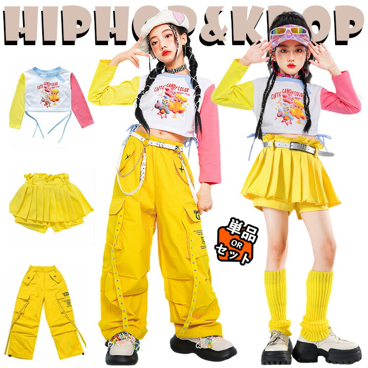 黄色 パーチワーク へそ出し キッズ ダンス衣装 セットアップ 女の子 子供 長袖 ゆたっりトップス ショート丈 サルエルパンツ カーゴパンツ スカート チア チアガール hiphop jazz