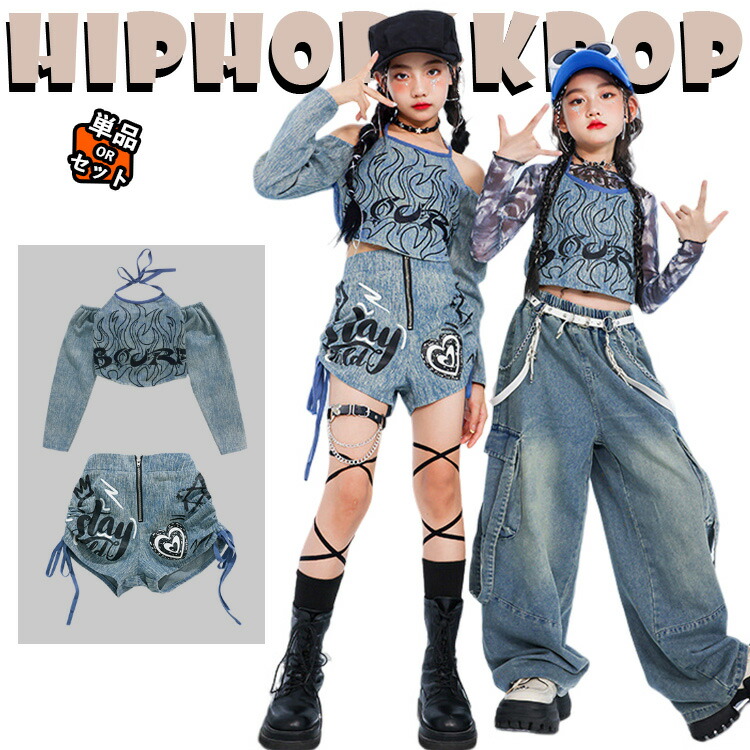 デニム ブルー 総柄 へそ出し 肩出し キッズ ダンス衣装 セットアップ 女の子 子供 長袖 インナー タンクトップ サルエルパンツ ショートパンツ カーゴパンツ チア チアガール hiphop