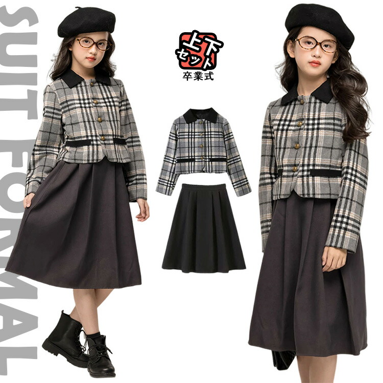 卒業式 スーツ 女の子 チェック柄 卒服 スカートスーツ 小学生 中学生 コート スカート 韓国 入学式 ブラック ピアノ発表会 スーツ 女子 長袖 演奏会 チェックジャケット 2点セット