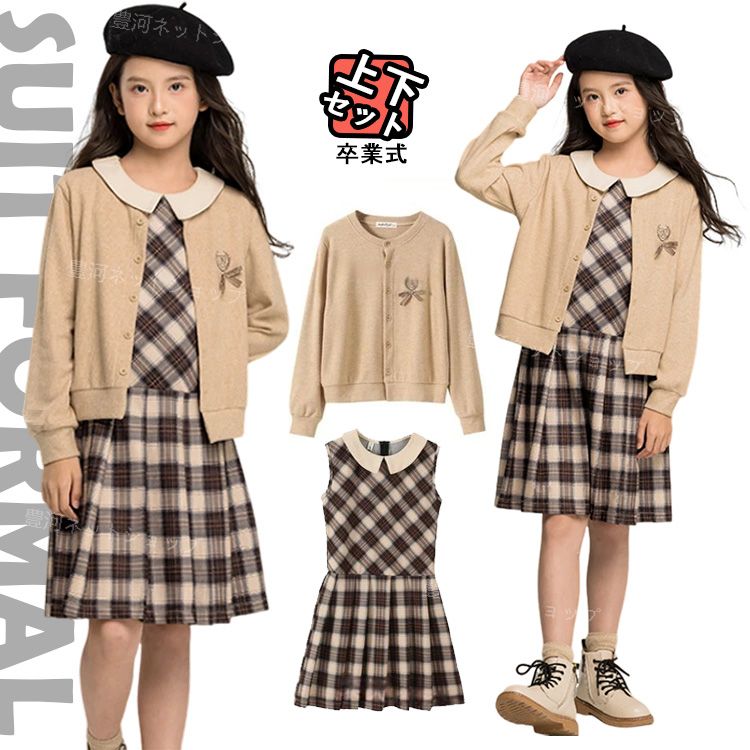 卒業式 スーツ 女の子 チェック柄 ワンピーススーツ ニートトップス 韓国 入学式 卒服 ワンピース 小学生 中学生 ブラウン 茶色 ピアノ発表会 スーツ 女子 長袖 演奏会 2点セット フ