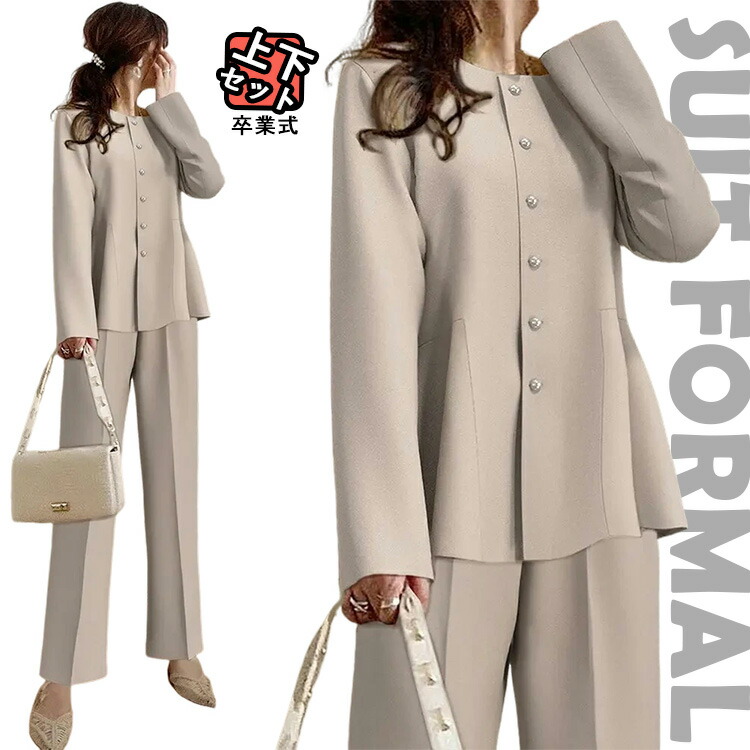 卒業式 スーツ 母 30代 スーツ レディース セット 2点セット 入学式 ママスーツ ベージュ 40代 きれいめ 体型カバー スーツ 大きいサイズ 洗える 着回しノーカラー フォーマル テー