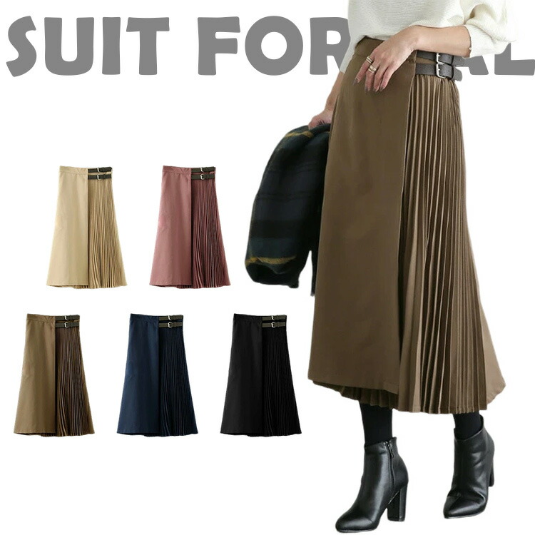サイドプリーツ スカート ラップスカート アシンメトリー ラップ デザイン ベルト付 プリーツ切替 ロング ボトムス ドッキンング オフィス バレンタイン デート コーデ 大人 カジュア