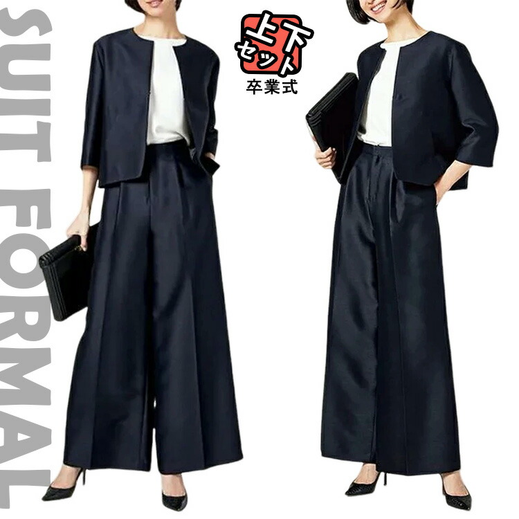 卒業式 スーツ 母 30代 スーツ レディース セット 2点セット ネイビー 入学式 ママスーツ ワイドパンツ ゆったり 40代 きれいめ ノーカラー 着回し 洗える フォーマル パンツスーツ