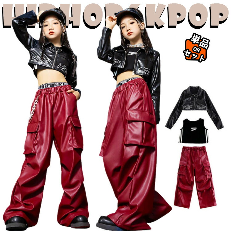 黒 レザージャケット 赤 レザーパンツ カーゴパンツ キッズ ダンス衣装 セットアップ 上下セット 韓国 jazz おしゃれ 女の子 子供 かっこいい かわいい 長袖 トップス タンクトップ