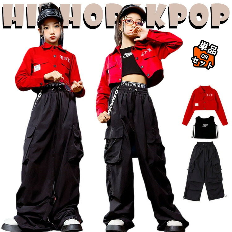 レッド ジャケット 黒 カーゴパンツ レーシング風 キッズ ダンス衣装 セットアップ 上下セット おしゃれ 韓国 jazz 女の子 子供 かっこいい かわいい 長袖 トップス タンクトップ ダ