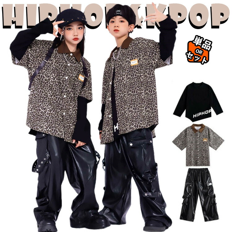 キッズ ダンス衣装 豹柄 ブラウン 半袖 カジュアルシャツ 黒 レザーパンツ カーゴパンツ セットアップ 上下セット おしゃれ 女の子 男の子 かっこいい かわいい 長袖 シャツ ダンス