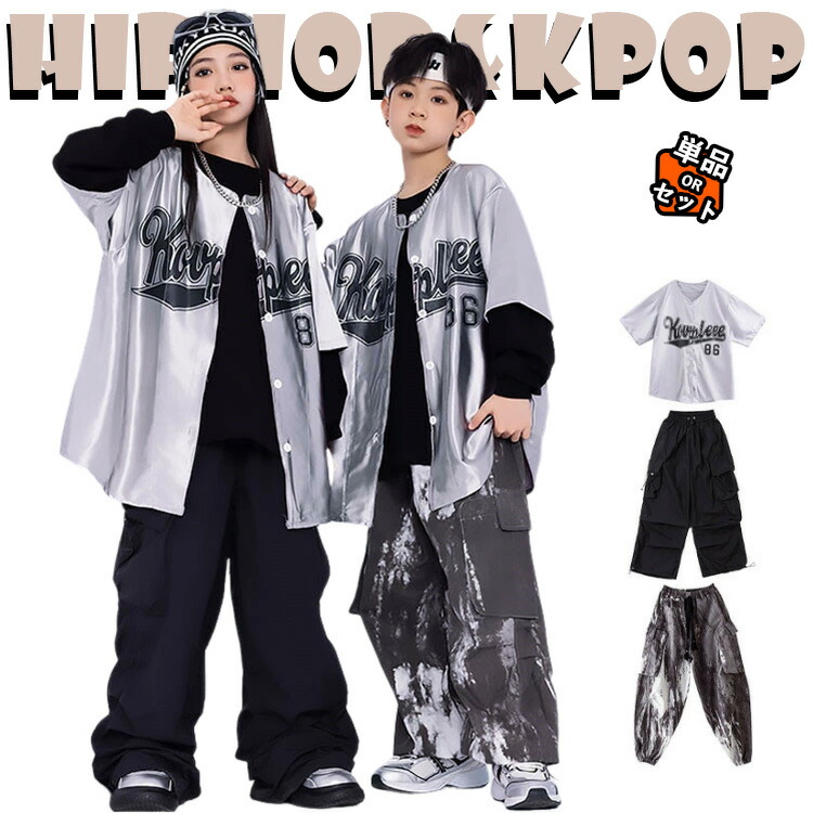 キッズ ダンス衣装 シルバー ベースボールシャツ ブラック カーゴパンツ シャツ セットアップ 上下セット おしゃれ 女の子 男の子 子供 かっこいい かわいい 半袖 トップス ダンスウ