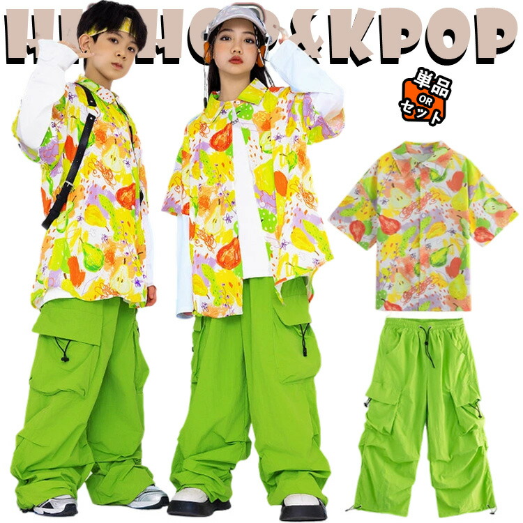 黄色 花柄 総柄 柄シャツ キッズ ダンス衣装 セットアップ jazz アロハシャツ 女の子 男の子 トップス 半袖 カジュアルシャツ ロングtシャツ ライナー へそ出し グリーン カーゴパン