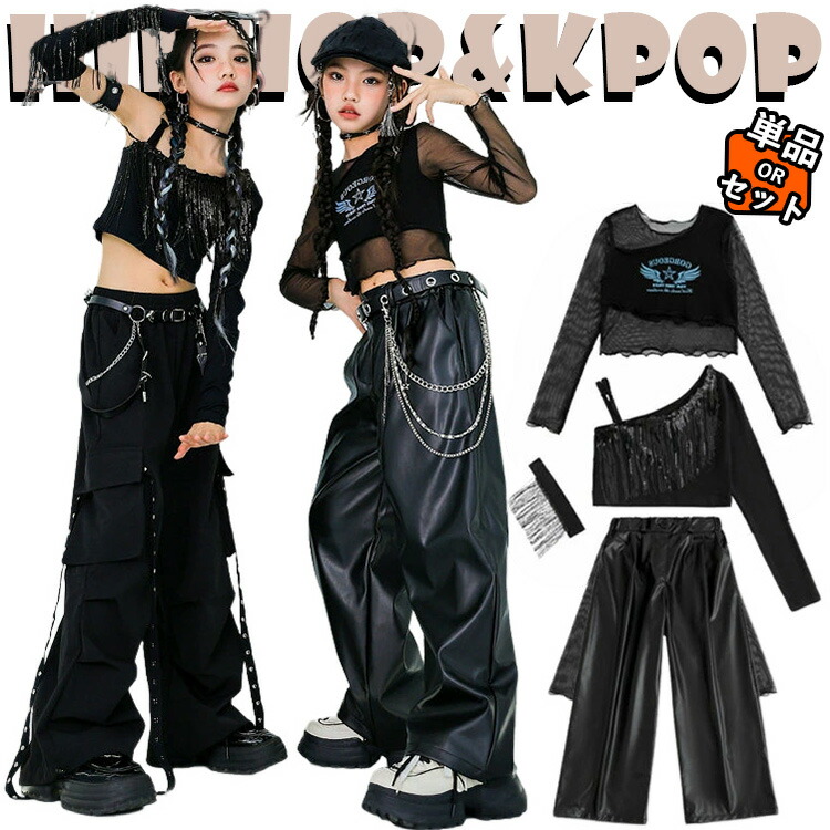キッズダンス衣装 セットアップ チア チアガール 韓国 k-pop 女の子 ショート丈 へそ出し 肩だし トップス 長袖 ファッション メッシュ素材 黒色 PU カーゴパンツ サルエルパンツ ジ