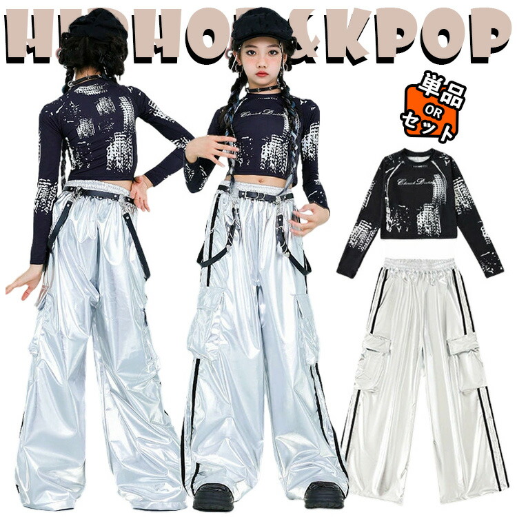 キッズ ダンス衣装 シルバー ベースボールシャツ ブラック カーゴパンツ Tシャツ セットアップ 上下セット おしゃれ 女の子 男の子 子供 かっこいい かわいい 半袖 トップス ダンスウ