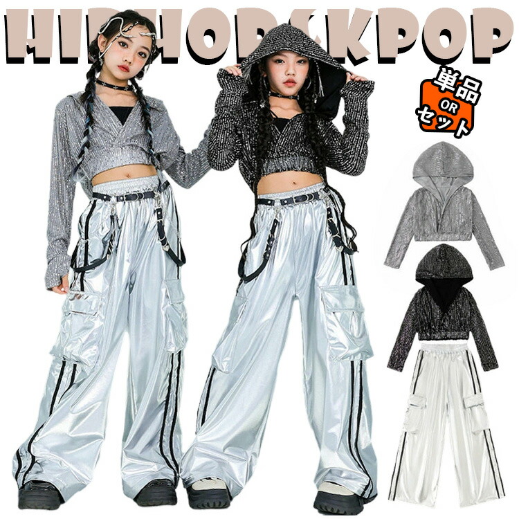 キッズダンス衣装 セットアップ長袖 カバーアップ パーカー 女の子 チア チアガール 韓国 ファッション ショート丈 トップス キャミソール へそ出し キラキラ シルバー サルエルパン