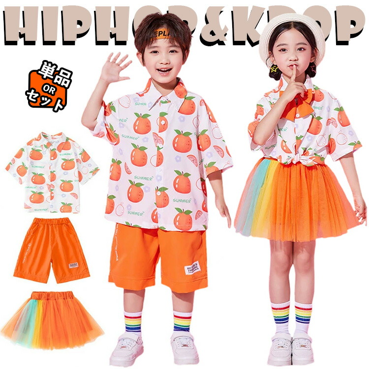 チア チアガール 白 カジュアルシャツ オレンジ パンツ チュールスカート キッズ ダンス衣装 セットアップ 上下セット おしゃれ 女の子 男の子 子供 かっこいい かわいい 半袖 ダンス