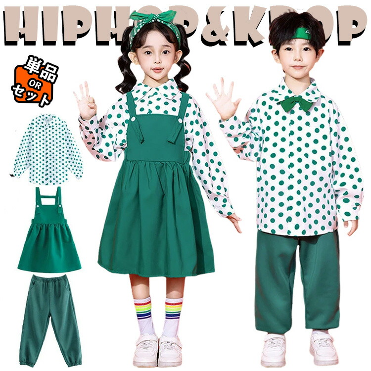 水玉柄 シャツ 総柄 緑 ウェストパンツ ジャンパースカート キッズ ダンス衣装 セットアップ 上下セット チア チアガール おしゃれ 女の子 男の子 かっこいい かわいい 長袖 ダンスウ